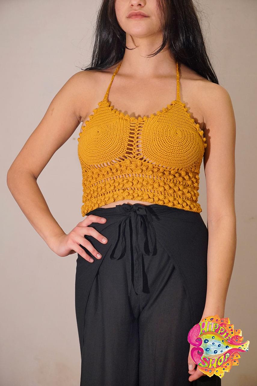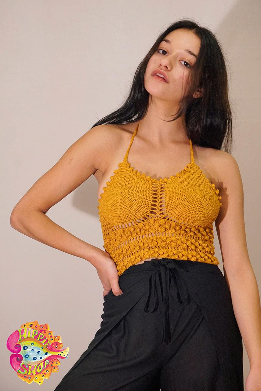 Τοπ πλεκτό στο χέρι, 60% βαμβάκι 40% ακρυλικό, one size, boho, ethnic και χρώματος μουσταρδί