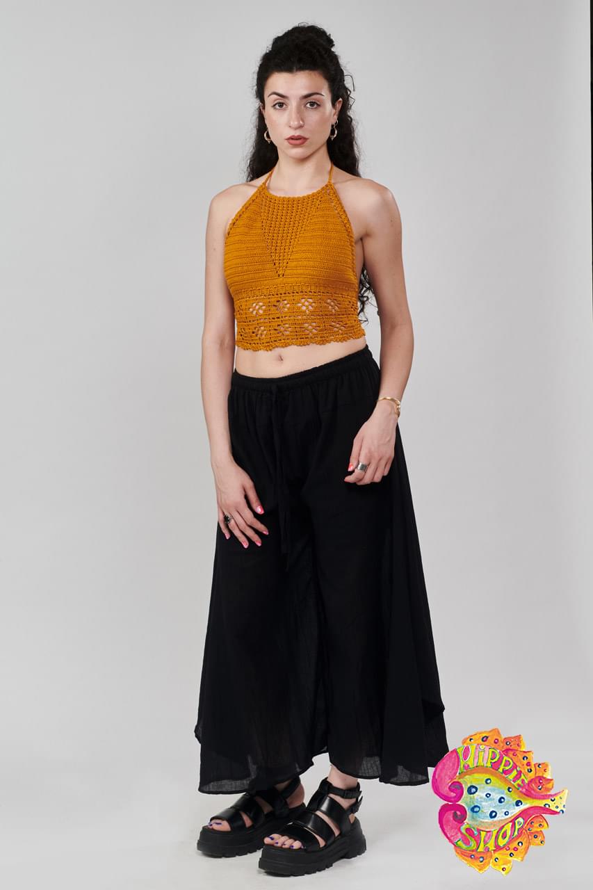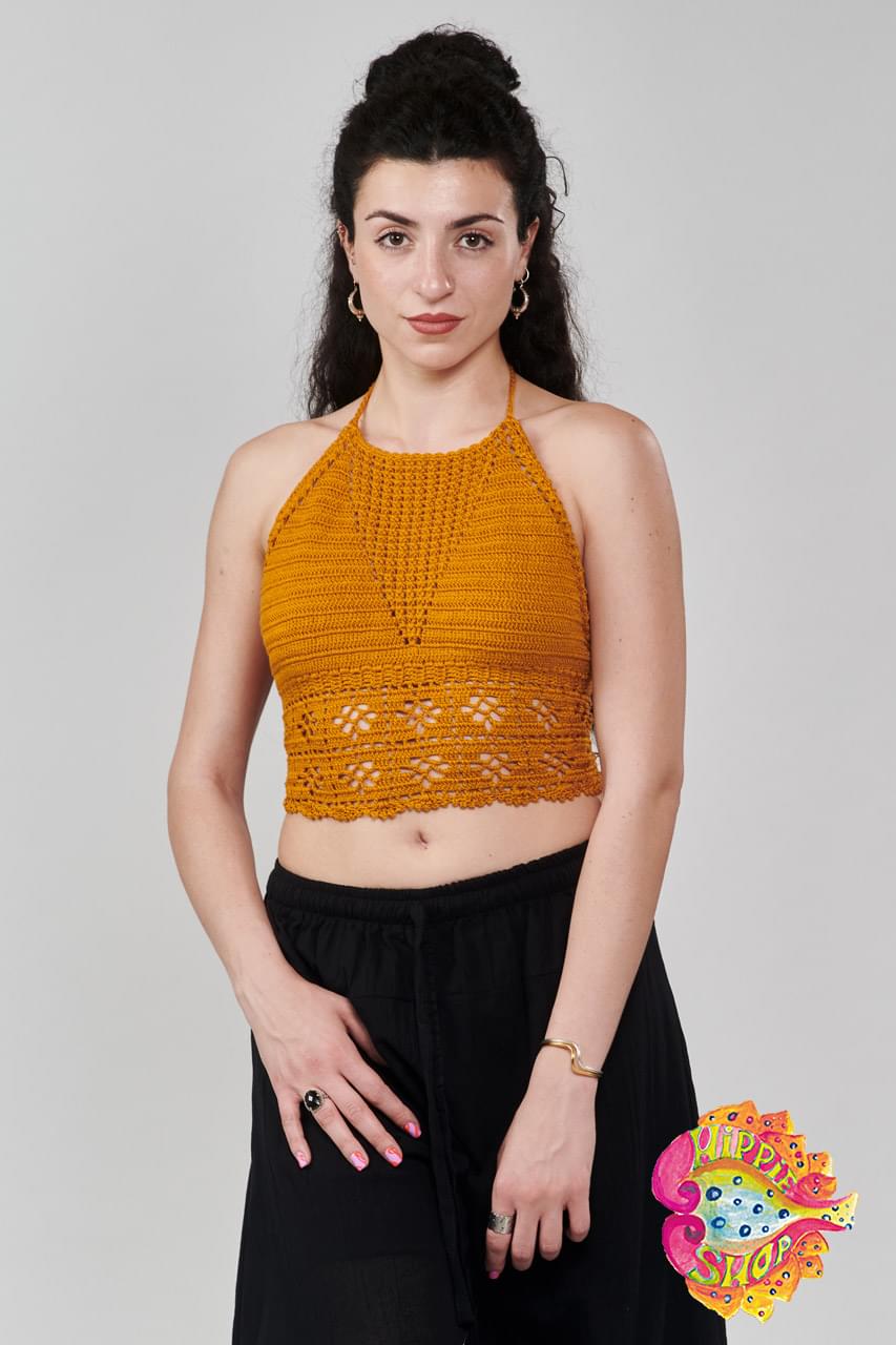 Τοπ πλεκτό χειροποίητο, βαμβακερό, boho, ethnic, one size, χρώματος μουσταρδί.